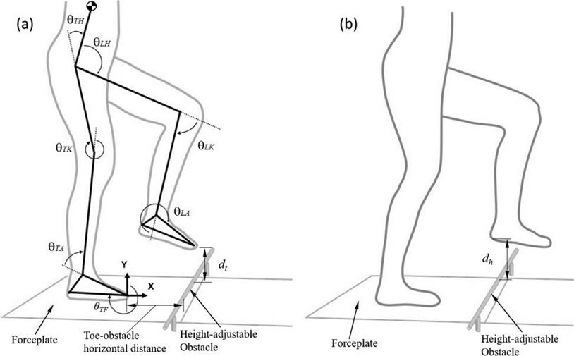 Figure 3. The planar seven-link model of the body during obstacle-crossing. Two forceplates are placed on either side of the obstacle. a Definitions of the toe-obstacle clearance and the joint angles are also indicated: hip (θ_LH), knee (θ_LK) and ankle (θ_LA) of the leading swing-limb, and foot (θ_TF), ankle (θ_TA), knee (θ_TK) and hip (θ_TH) of the trailing stance-limb. The upper body, namely the segments of the head/neck, trunk, pelvis, and upper extremities, was modeled as a single link, defined as the line connecting the hip joint center and the center of mass of all the upper body segments. The hip angles were defined as the angles between the upper body link and the thigh links. The X-axis indicates the direction of progression.