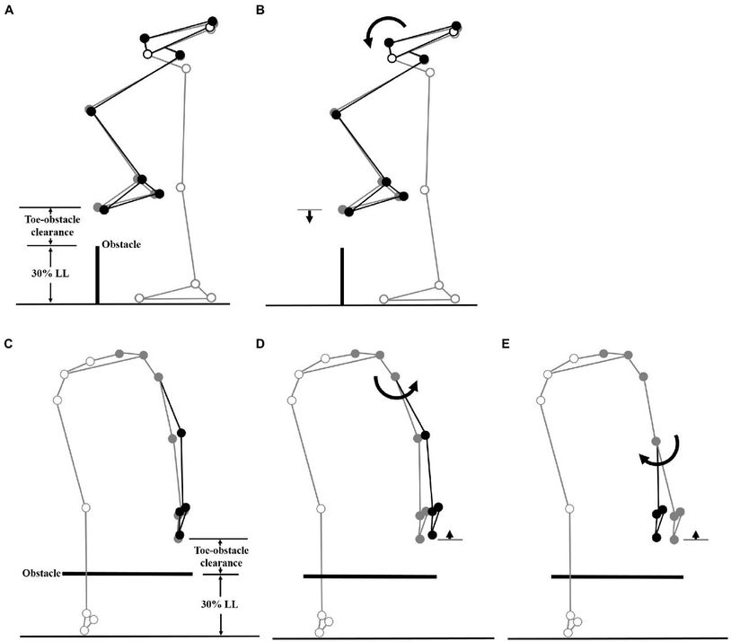 Figure 4. Effects of the observed significant angular changes at individual joints on the leading toe-obstacle clearance in the MCI group (black stick figure) compared to Control (A and C, grey stick figure) when the leading toe was above an obstacle of 30% leg length in height. The stick model was drawn using marker positions of a typical subject from each group. The segments with solid grey circles are joints of the reference limb. With the stance foot fixed to the ground, only one joint was rotated at a time, while keeping the angles of the other joints fixed, and the segments of the stance limb and the segments of the swing limb distal to the current joint stationary. The MCI group showed increased pelvic anterior tilt (B), and increased hip abduction (D) and knee adduction (E) in the swing limb. As indicated by the black stick figure, while (D, E) tended to increase the leading toe-obstacle clearance, (B) gave the opposite effect, leading to the observed normal toe-obstacle clearance.